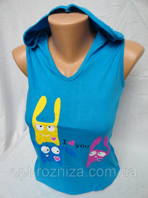 Молодіжна майка з капюшоном. Спереду майки є малюнок. У яскравих літніх кольорах.